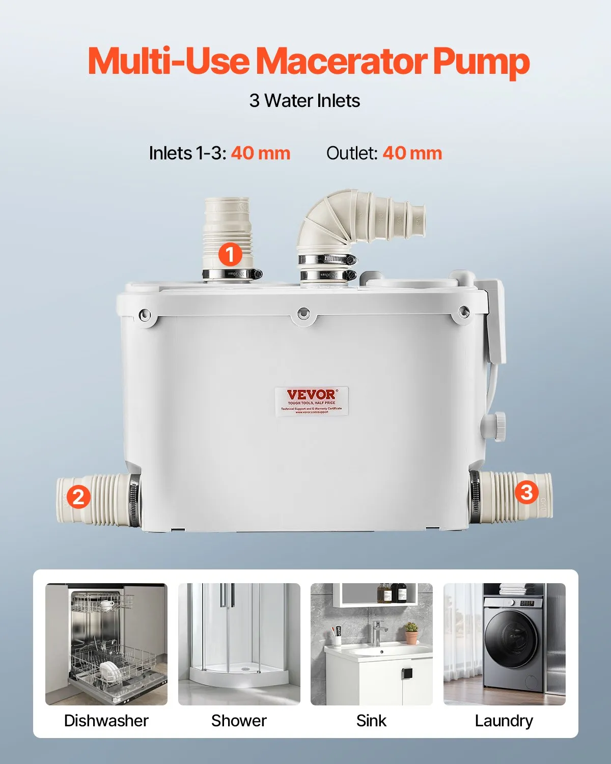 The VEVOR 500W macerator pump is a compact wastewater disposal/lift pump designed for small-space installs where gravity drain isn’t possible. It’s rated at 0.7 HP/500W with a stated max flow of 29 GPM (110 LPM) and a max head lift of 26 ft (8 m). With four inlets (one large plus three smaller), it’s intended to connect multiple fixtures such as a sink, shower, or tub, while stainless steel blades grind hair/debris to help reduce clogs. The IPX8 copper motor and delay-start function are positioned to improve durability and reduce frequent cycling.